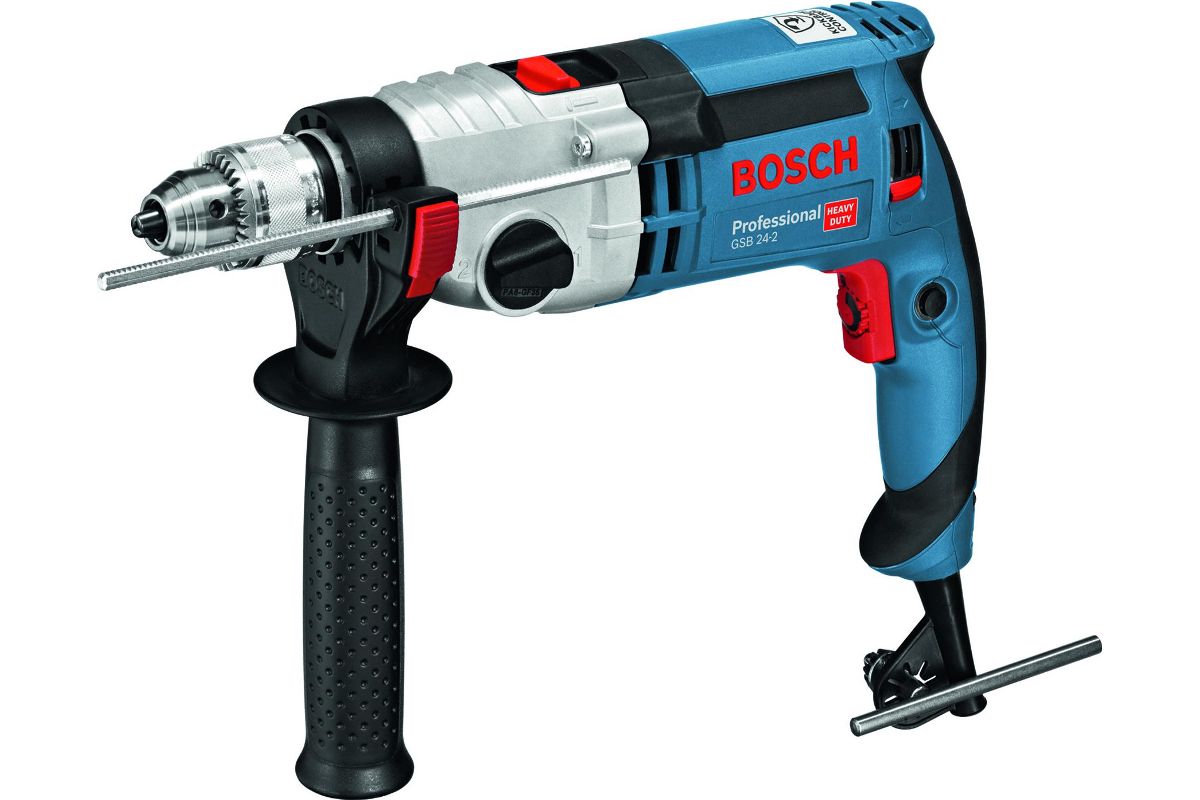 Двухскоростная ударная дрель с функцией защиты пользователя KickBack Control для работы в самых сложных условиях GSB 24-2. Идеальна для сверления отверстий большого диаметра благодаря высокопроизводительному двигателю мощностью 1100 Вт и высокому крутящему моменту. Прочный металлический корпус редуктора. ЗВП. 2 скорости, реверс. Предохранительная муфта. Мощность - 1100 Вт, скорость вращения - 0-900/3000 об/мин, число ударов - 0-51000, бетон/сталь/дерево-22/16/40GSB 24-2, L-Case, патрон с ключом